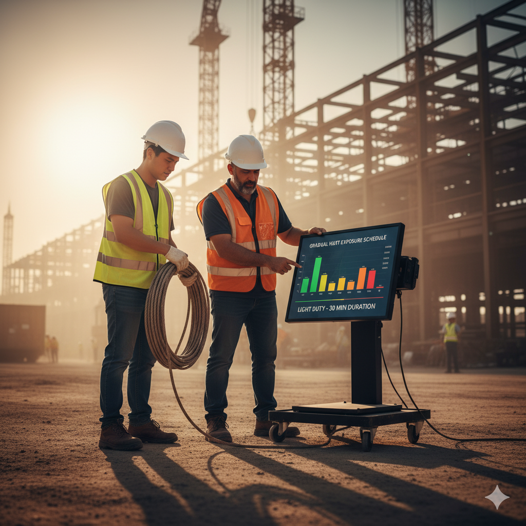Gradually introduce new or returning workers to hot environments over 7–14 days. Sudden exposure increases the risk of heat-related illness. Acclimatization allows the body to adapt and reduces the likelihood of fatigue, dehydration, or heat stroke.