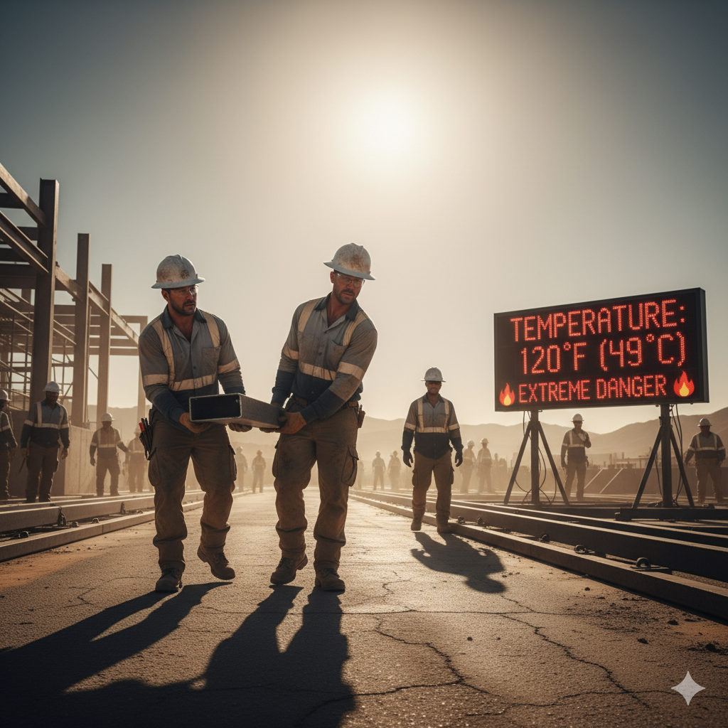 Construction heat stress, workplace safety, outdoor worker health, heat hazards, HSE construction site, summer construction risks,