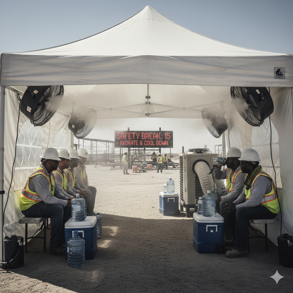Implement “work-rest cycles” based on the heat index. Provide regular rest breaks in shaded areas or with portable cooling systems such as fans or air-conditioned tents.